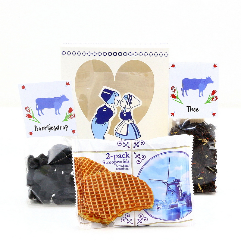 Breng een glimlach op iemands gezicht met dit Hollandse geschenkdoosje! Deze prachtige box – met het iconische beeld van het kusje tussen de boer en boerin in Delfts Blauwe stijl – is gevuld met drie typisch Nederlandse lekkernijen die samen zorgen voor een authentiek en warm moment van genieten.