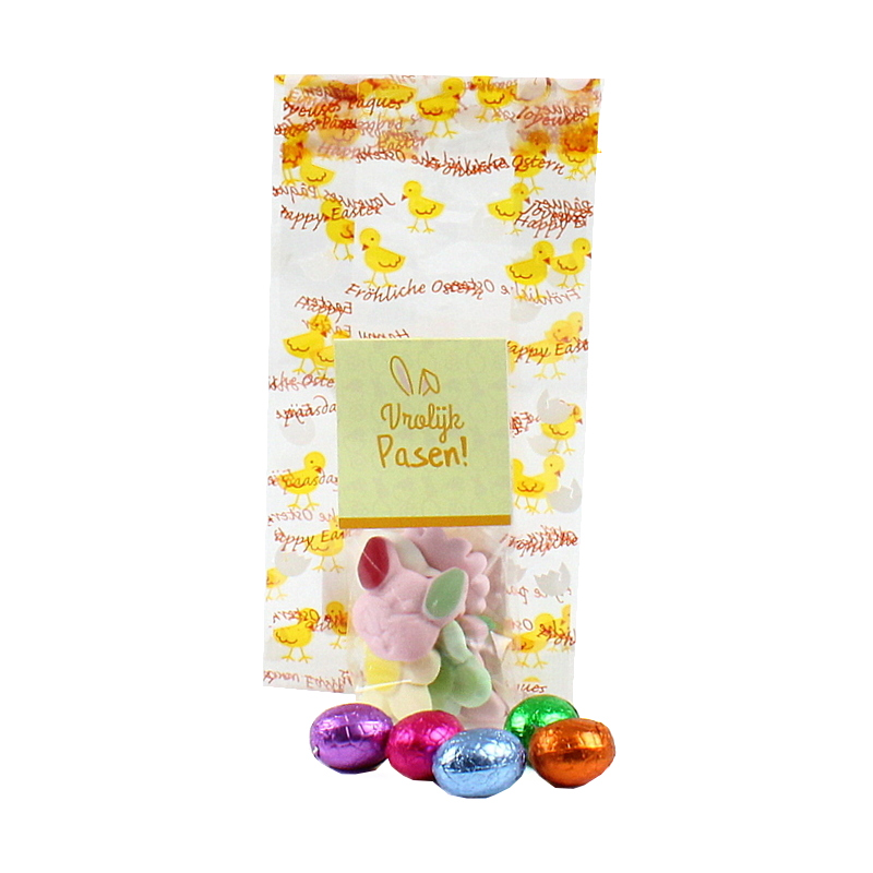Een vrolijk paaszakje vol lekkers! Dit feestelijke plastic paaszakje met schattige kuikenprint is gevuld met heerlijk paassnoep 40 gram en 5 chocolade paaseitjes. Een kleurrijke en smakelijke traktatie die meteen een glimlach oproept.